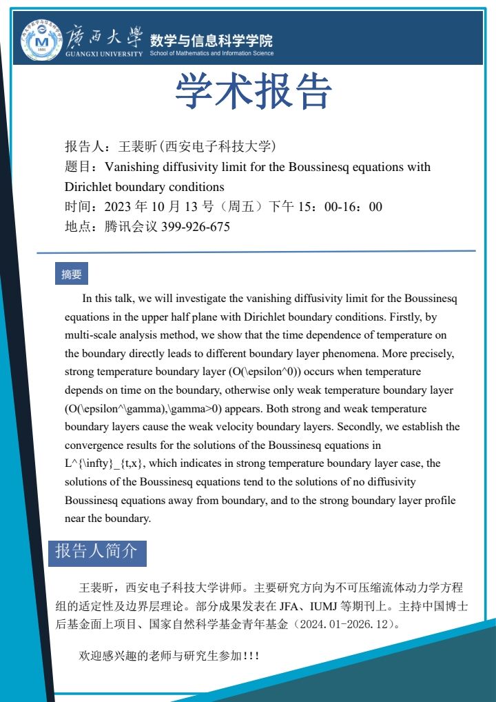 学术报告:Vanishing diffusivity limit for the Boussinesq equations with Dirichlet boundary conditions