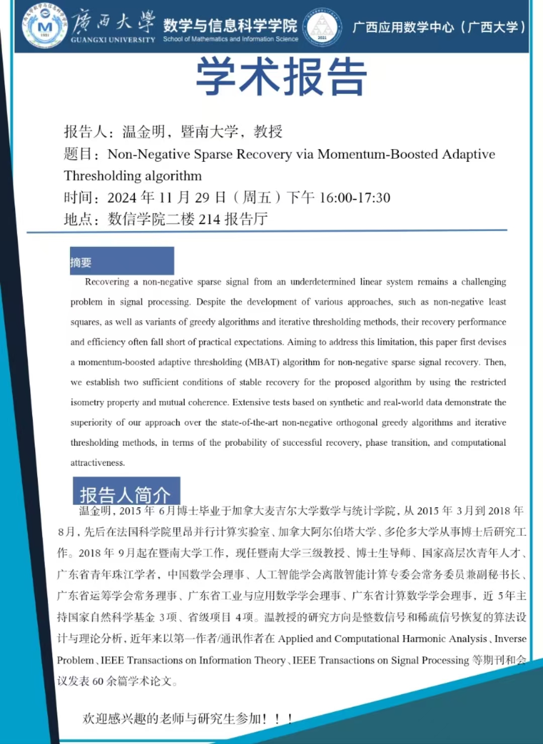 学术报告:Non-Negative Sparse Recovery via Momentum-Boosted Adaptive Thresholding algorithm