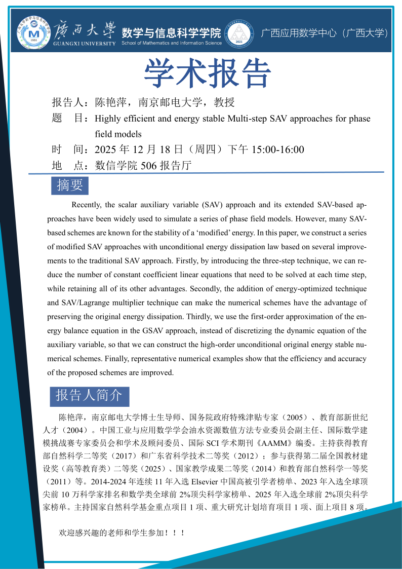 学术报告:Highly efficient and energy stable Multi-step SAV approaches for phase field models
