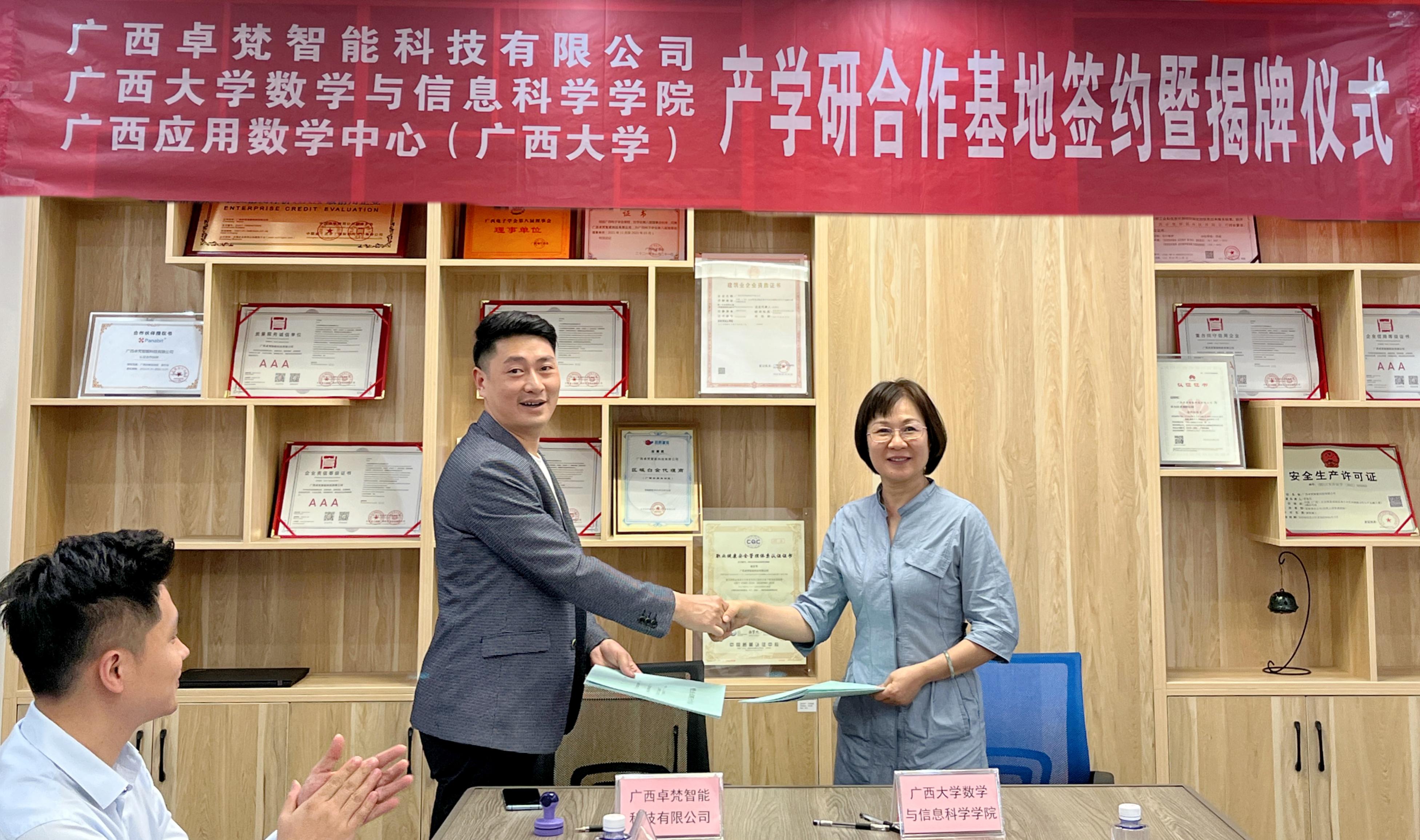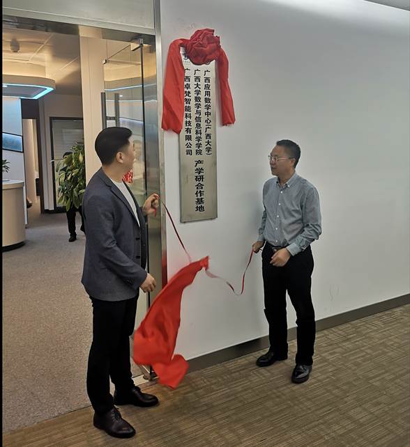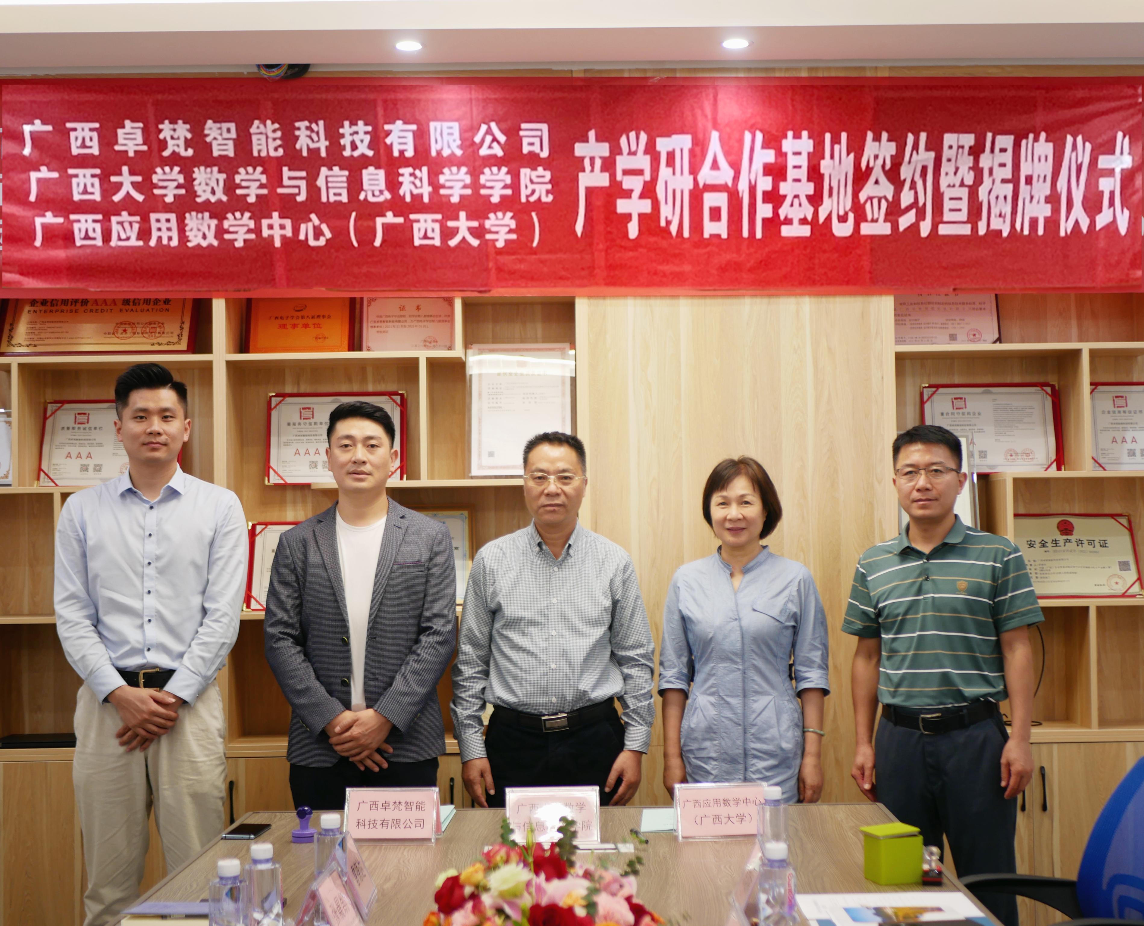 11月12日上午,院党委书记黄建荣带队一行4人前往广西卓梵智能科技有限公司举行产学研合作基地协议签约暨揭牌仪式。院党委副书记郭海燕,副院长、广西应用数学中心(beat365英国官网)执行主任袁功林分别代表学院和中心签约,黄建荣书记参加揭牌仪式。广西卓梵智能科技有限公司总经理舒建兵、商务部经理张晨凯、办公室主任张成瑞等公司领导员工参加仪式,广西咕咕狗科技有限公司产品发展中心知识产权总经理杜智广出席仪式。
