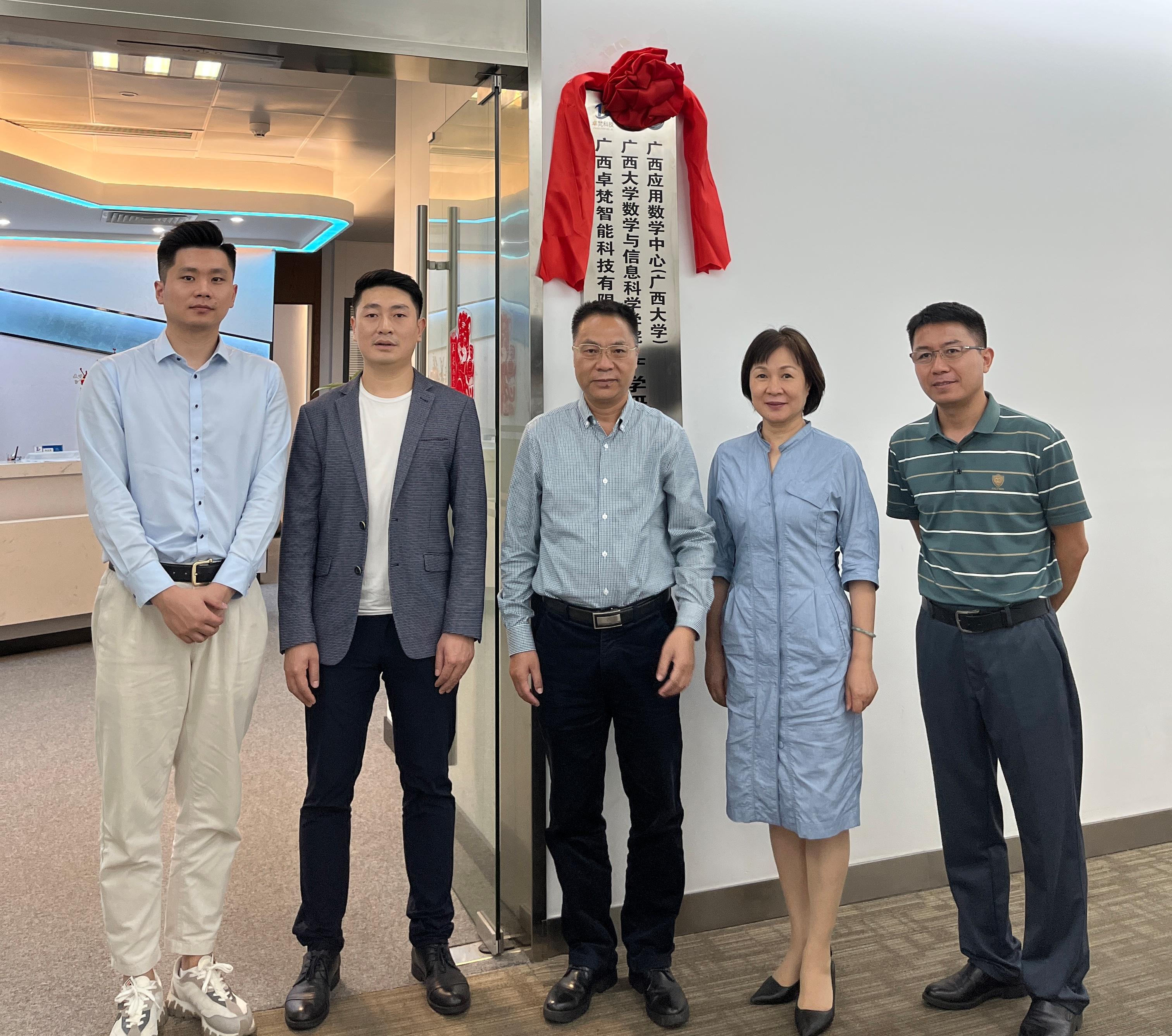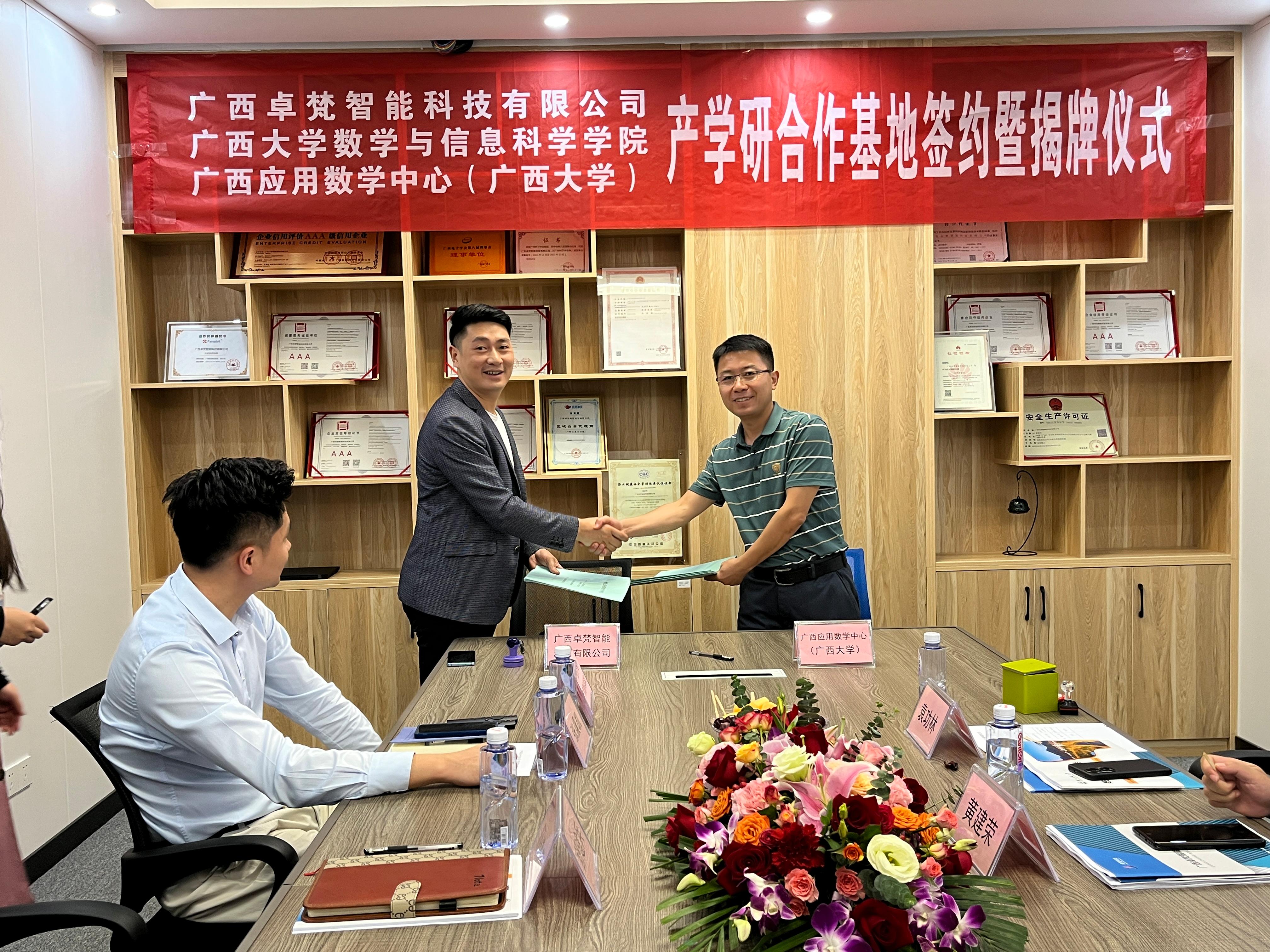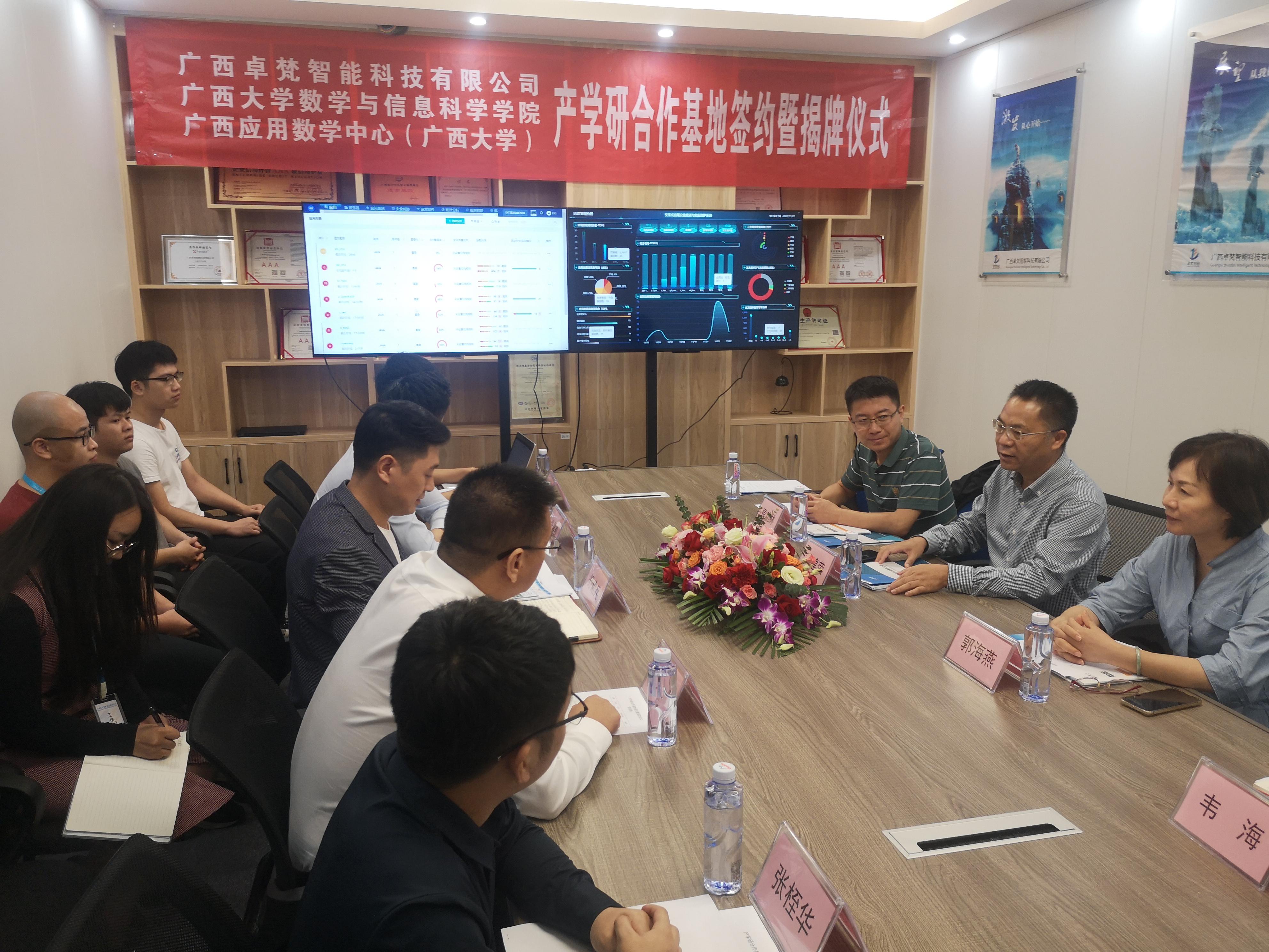 11月12日上午,院党委书记黄建荣带队一行4人前往广西卓梵智能科技有限公司举行产学研合作基地协议签约暨揭牌仪式。院党委副书记郭海燕,副院长、广西应用数学中心(beat365英国官网)执行主任袁功林分别代表学院和中心签约,黄建荣书记参加揭牌仪式。广西卓梵智能科技有限公司总经理舒建兵、商务部经理张晨凯、办公室主任张成瑞等公司领导员工参加仪式,广西咕咕狗科技有限公司产品发展中心知识产权总经理杜智广出席仪式。