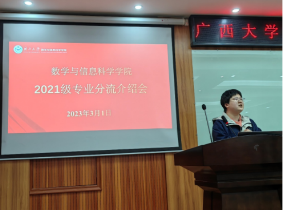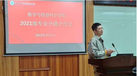 阳春三月,万物复苏。根据学校关于“关于做好2021级大类招生专业分流工作的通知”要求,为更好地做好学院2021级专业分流工作, 2023年3月1日,beat365官网在109报告厅召开了2021届专业分流介绍会,数学与应用数学系主任李靖建教授、信息与计算科学系副主任徐洁琼教授、数学类211班班主任刘楚箫博士、数学类212班班主任张幸博士及2021级数学类全体本科生参加本次分流专业介绍会。