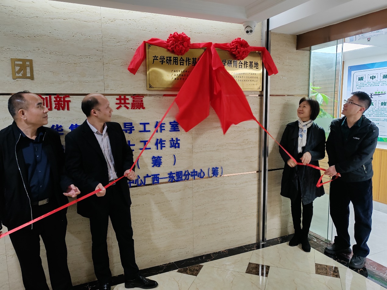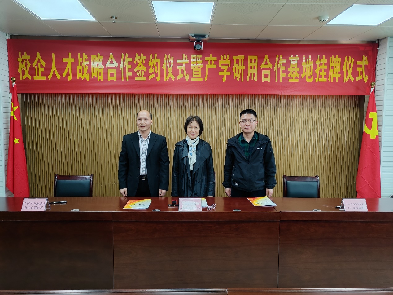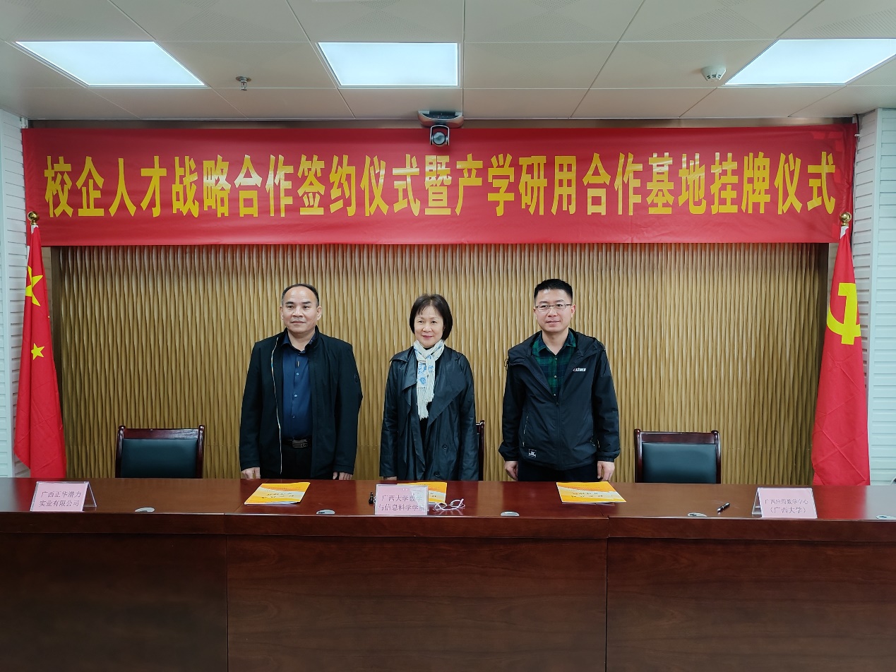 3月3日上午,数信学院、广西应用数学中心(beat365英国官网)分别与广西正华潜力实业有限公司、广西华力碳减排技术有限公司举行校企人才战略合作签约仪式暨产学研用合作基地揭牌仪式。院党委副书记郭海燕,副院长、广西应用数学中心(beat365英国官网)执行主任袁功林分别代表学院和中心签约并参加揭牌仪式,并与两家企业深入进行座谈交流。广西正华潜力实业有限公司董事长黄深、总经理韦庆飞、副总经理佘乾仲、碳汇部经理谢庆贤,广西华力碳减排技术有限公司董事长李兰然,以及两家企业部分干部员工参加上述活动。