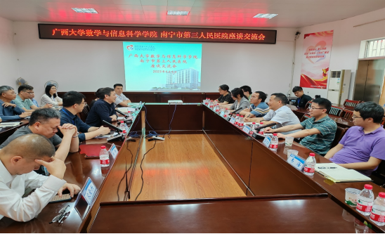 值此教育部《普通高等教育学科专业设置调整优化改革方案》发布之际,为拓宽基础学科应用面向,构建“基础+应用”复合培养体系,探索“数学+医学”学科交叉发展模式,为医学卡脖子问题提供数学方案,4月4日下午,学院院长郭真华教授带队率领学院教师一行九人前往南宁市第三人民医院开展学术交流活动。南宁第三人民医院院长樊志勇及领导班子成员、全体中层干部及心内科、神经科全体医务人员参加了此次活动。