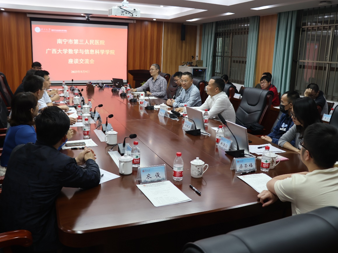 在座谈交流环节,南宁第三人民医院副院长符黄德带领随行人员,一一梳理了大家在医疗中遇到的难点和数学医学问题,希望借助beat365英国官网数信学院的人才团队和平台,提高医院的医疗诊治水平,为南宁第三人民医院的高质量发展注入强劲动力。郭真华院长认真听取了大家提出的问题和诉求,积极给与了回应,并根据问题当场组建了三个跨学科研究小组。他指出,数学和医学“联姻”,既要求对医学问题要有深刻的认识,又对数学学科的研究发展提出了更高的要求,用数学实现精准医疗,为医学难题提供数学方案,也是数学学科的光荣使命。南宁市三医院作为心血管专科医院,数学在血液动力学方面的应用潜力巨大、前景广阔,希望双方在进一步合作中优势互补,携手共进,促进互利共赢局面。