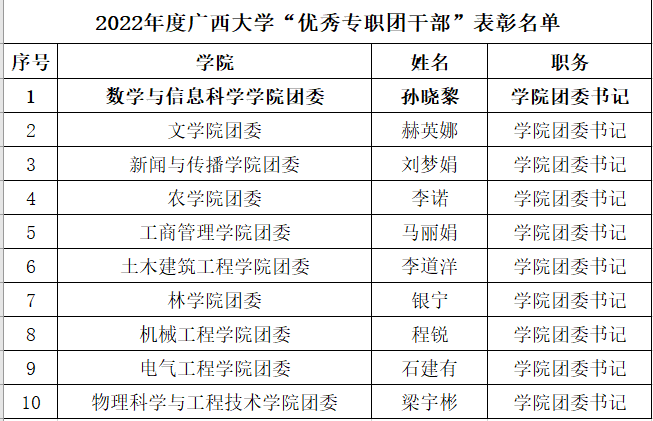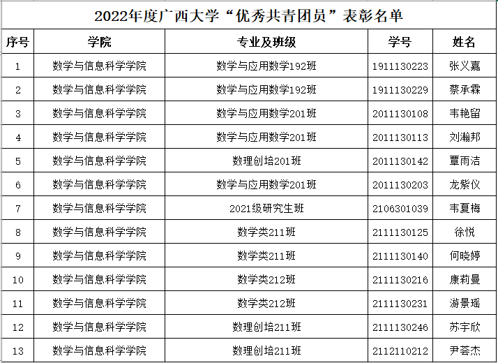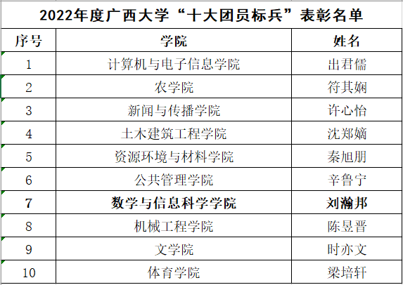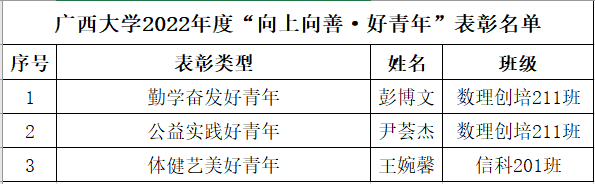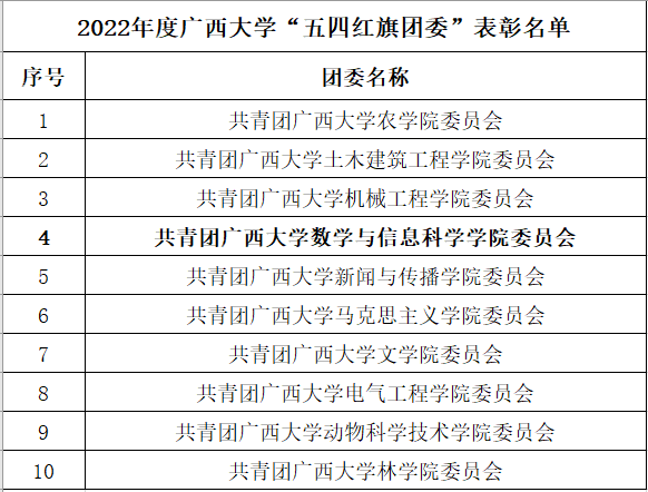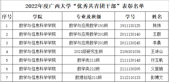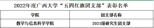 共青团beat365英国官网数学与信息科学学院委员会荣获2022年度beat365英国官网“五四红旗团委”称号;院团委书记孙晓黎荣获2022年度beat365英国官网“优秀专职团干部”称号;2021级研究生团支部荣获2022年度beat365英国官网“五四红旗团支部”称号;应数201班刘瀚邦同学荣获2022年度beat365英国官网“十大团员标兵”称号;陈炜等7名同学荣获2022年度beat365英国官网“优秀共青团干部”称号;张义嘉等13名同学荣获2022年度beat365英国官网“优秀共青团员”称号;彭博文等3名同学荣获2022年度beat365英国官网“向上向善·好青年”称号。