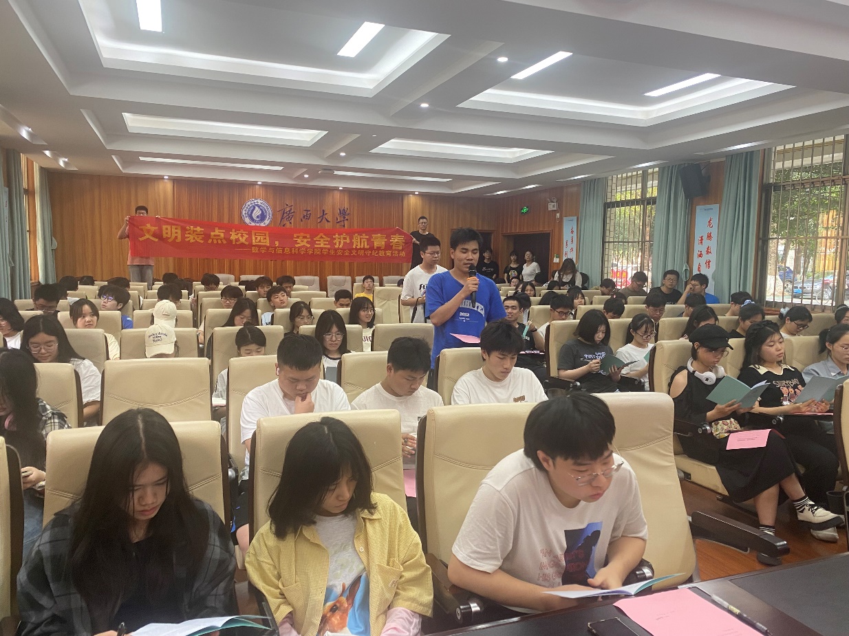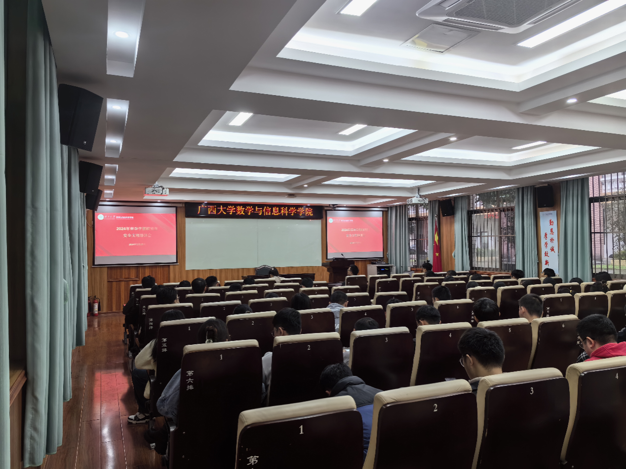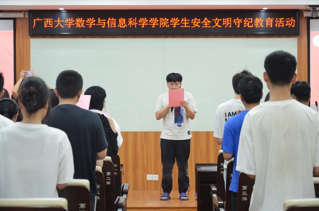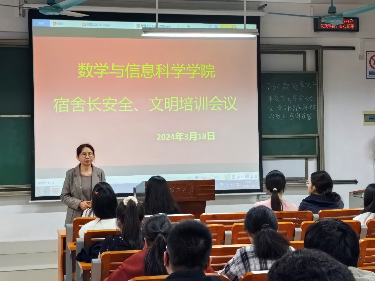 全体学生在会上共同学习《数学与信息科学学院学生安全文明守纪提示》小册子,其中安全提示涵盖人身安全、财产安全、网络安全、交通安全、消防安全、社交安全等内容,文明提示涵盖课堂文明、举止文明、宿舍文明、网络文明、就餐文明、诚信文明等内容。