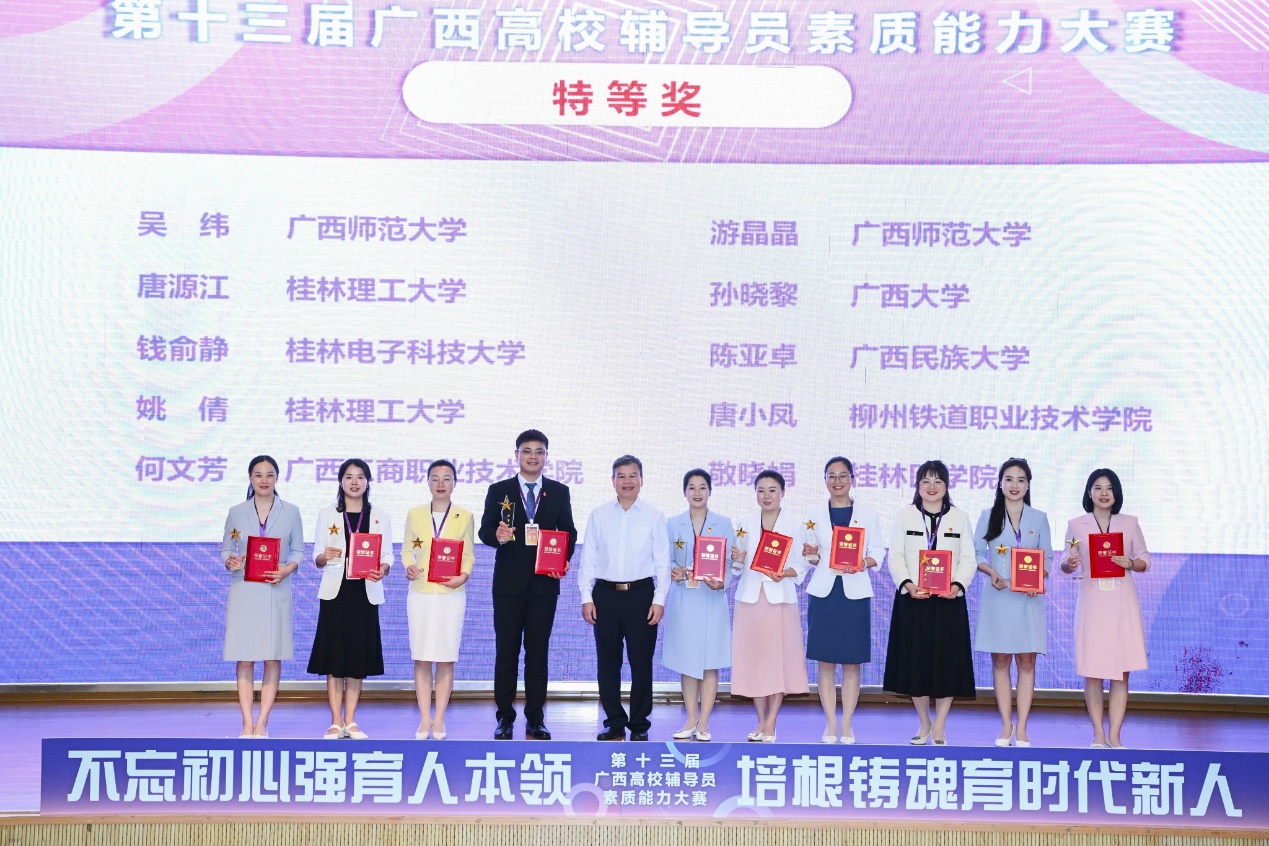 4月17至20日,由自治区教育厅主办,教育部高校思想政治工作队伍培训研修中心(广西师范大学)承办的第十三届广西高校辅导员素质能力大赛在广西师范大学举办。beat365官网团委书记、辅导员孙晓黎老师荣获大赛特等奖和案例研讨单项“最佳表现奖”。共有来自全区各高校的108名专职辅导员参赛。
