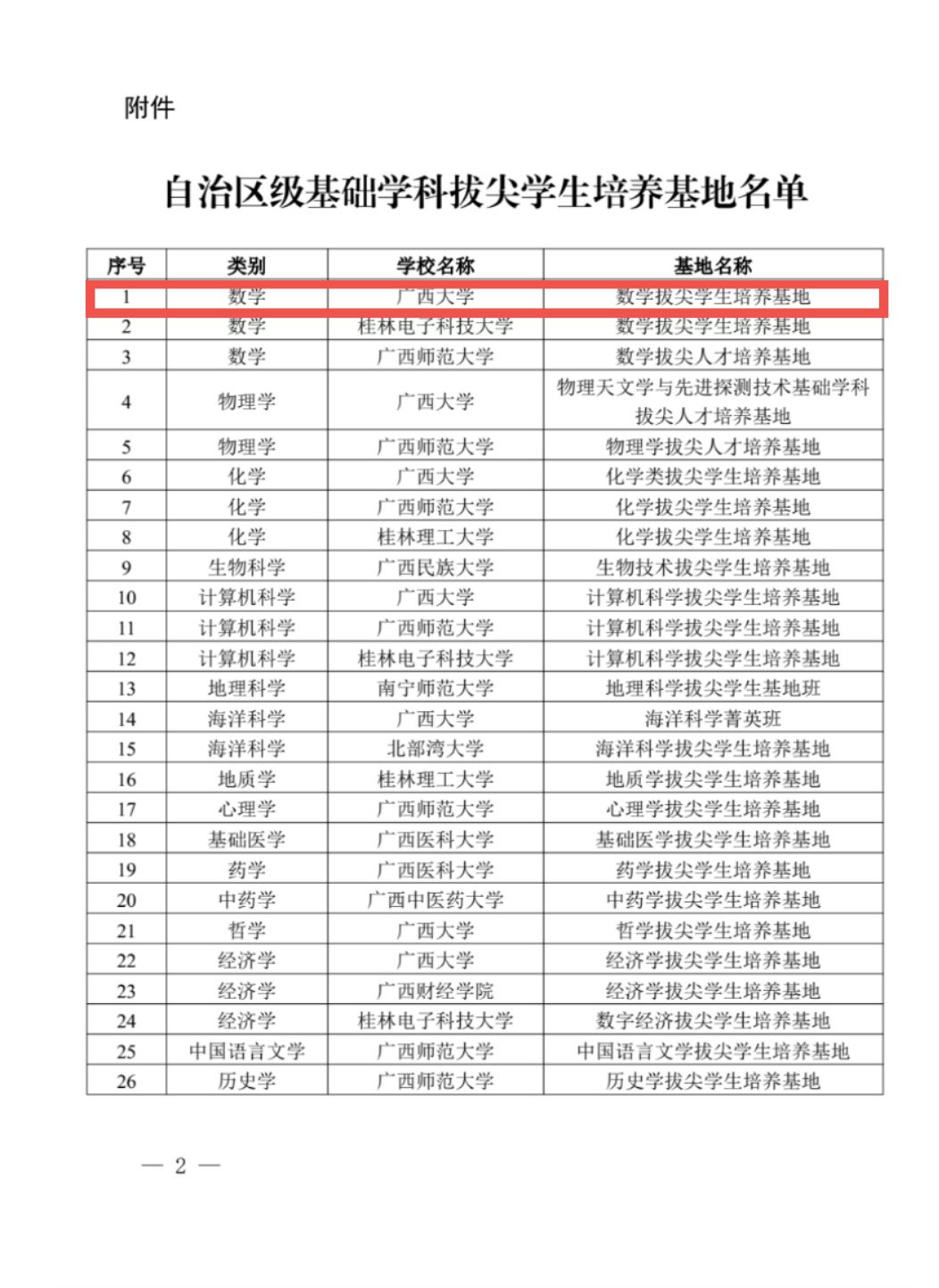 近日,自治区教育厅公布了自治区级基础学科拔尖学生培养基地名单,beat365官网数学拔尖学生培养基地入选。全区共遴选确定26个自治区级基础学科拔尖学生培养基地,其中beat365官网共7个基地入选自治区级基础学科拔尖学生培养基地。