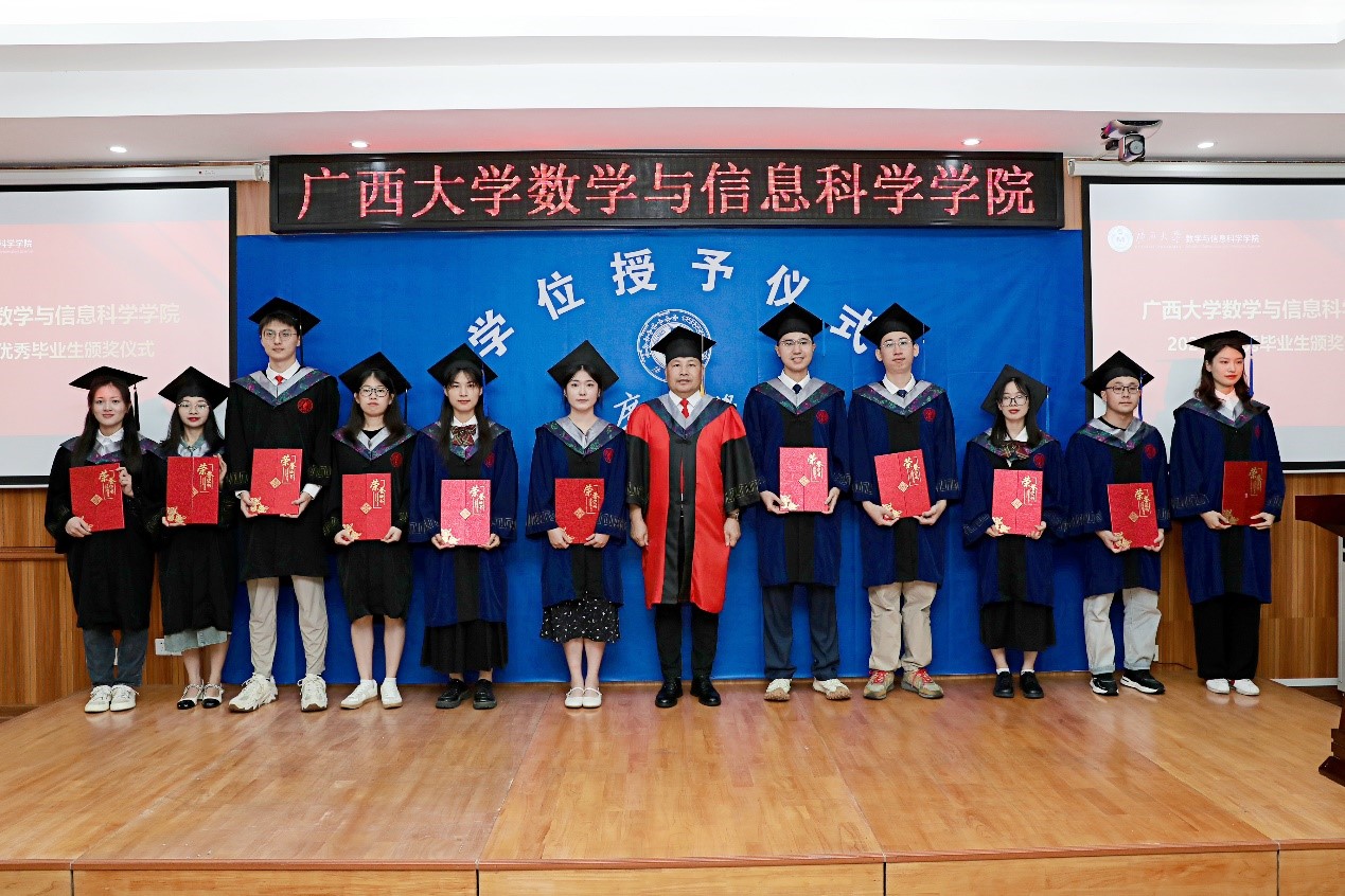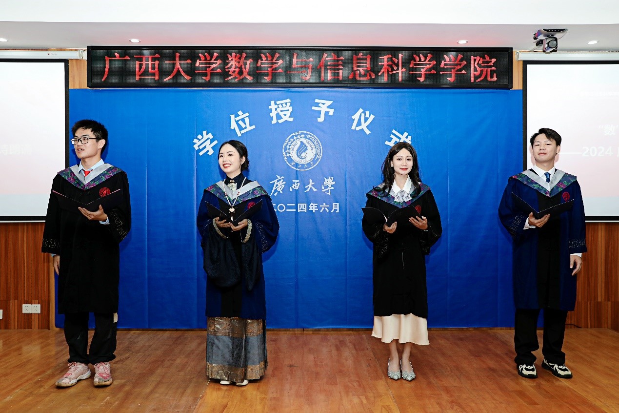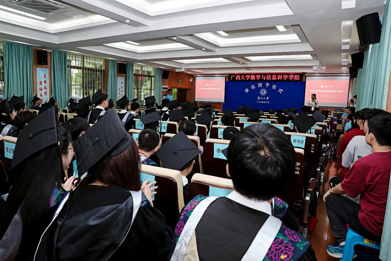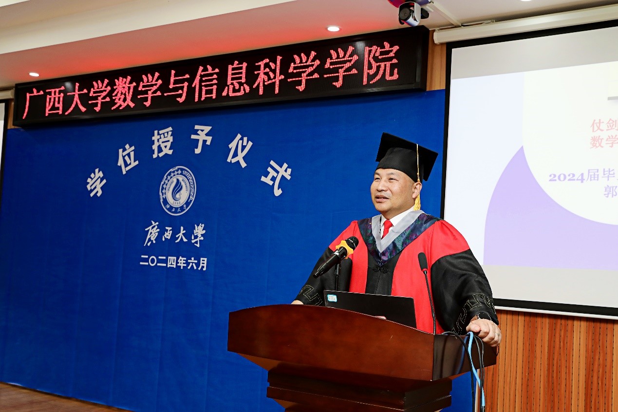 花开满盛夏,毕业致青春。6月25日上午,数学与信息科学学院2024届毕业生学位授予仪式暨毕业生欢送会在学院109隆重举行。院长郭真华、学院领导班子全体成员、beat365英国官网第十四届学位评定委员会数学与信息科学学院分委员会委员、广西鸿途驾培集团董事长连建耀、各系主任、班主任、教师代表、全体辅导员以及2024届毕业生一同参加仪式,仪式由学院党委副书记唐旭彬主持。