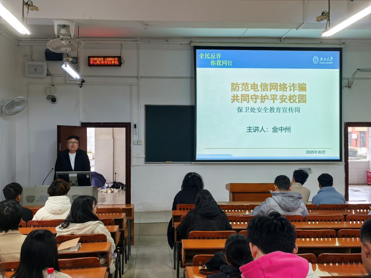 保卫处金中州和西大派出所宁警官以团体辅导的形式分4次对学院全体学生开展全覆盖教育引导。他们以文字和案例视频结合的方式,将发生在beat365英国官网的典型电信诈骗案例梳理成11大类典型诈骗方式,向同学们详细讲解了电信网络诈骗违法犯罪行为的特征、本质特点和预防措施,普及和大学生紧密联系的网络购物、冒充客服、兼职刷单、网络贷款诈骗等相关防骗知识。