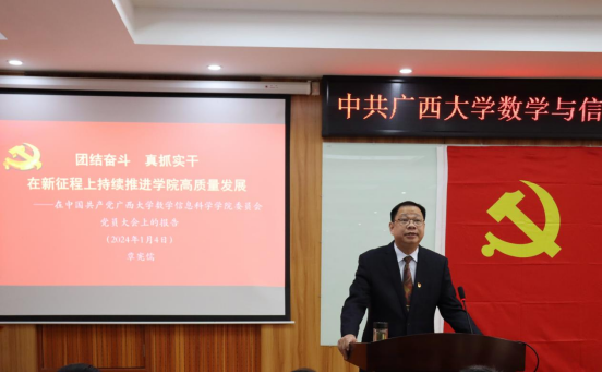 1月4日下午,中国共产党beat365英国官网数学与信息科学学院委员会党员大会在学院109报告厅顺利召开,圆满完成各项议程。学院党委书记覃宪儒同志代表中国共产党beat365英国官网数学与信息科学学院委员会作题为《团结奋斗 真抓实干 在新征程上持续推进学院高质量发展》的报告。校党委组织部副部长陈世扬同志到会指导。学院党委副书记、纪委书记唐旭彬同志主持会议。