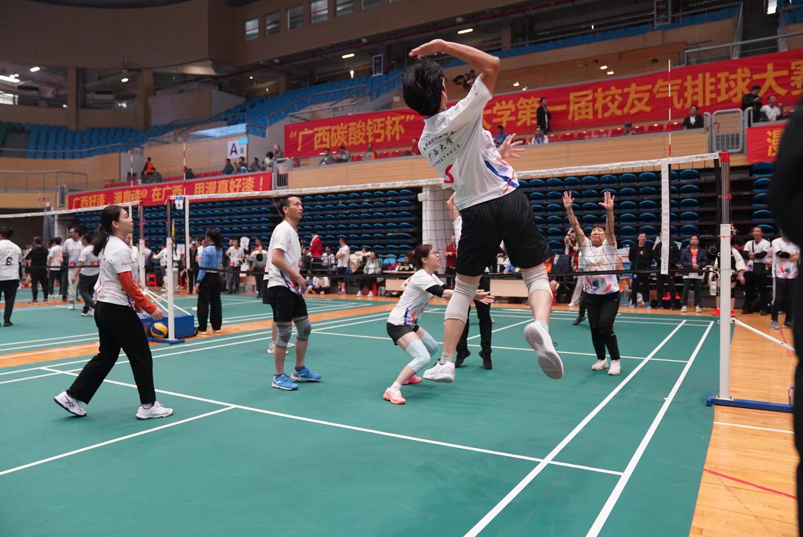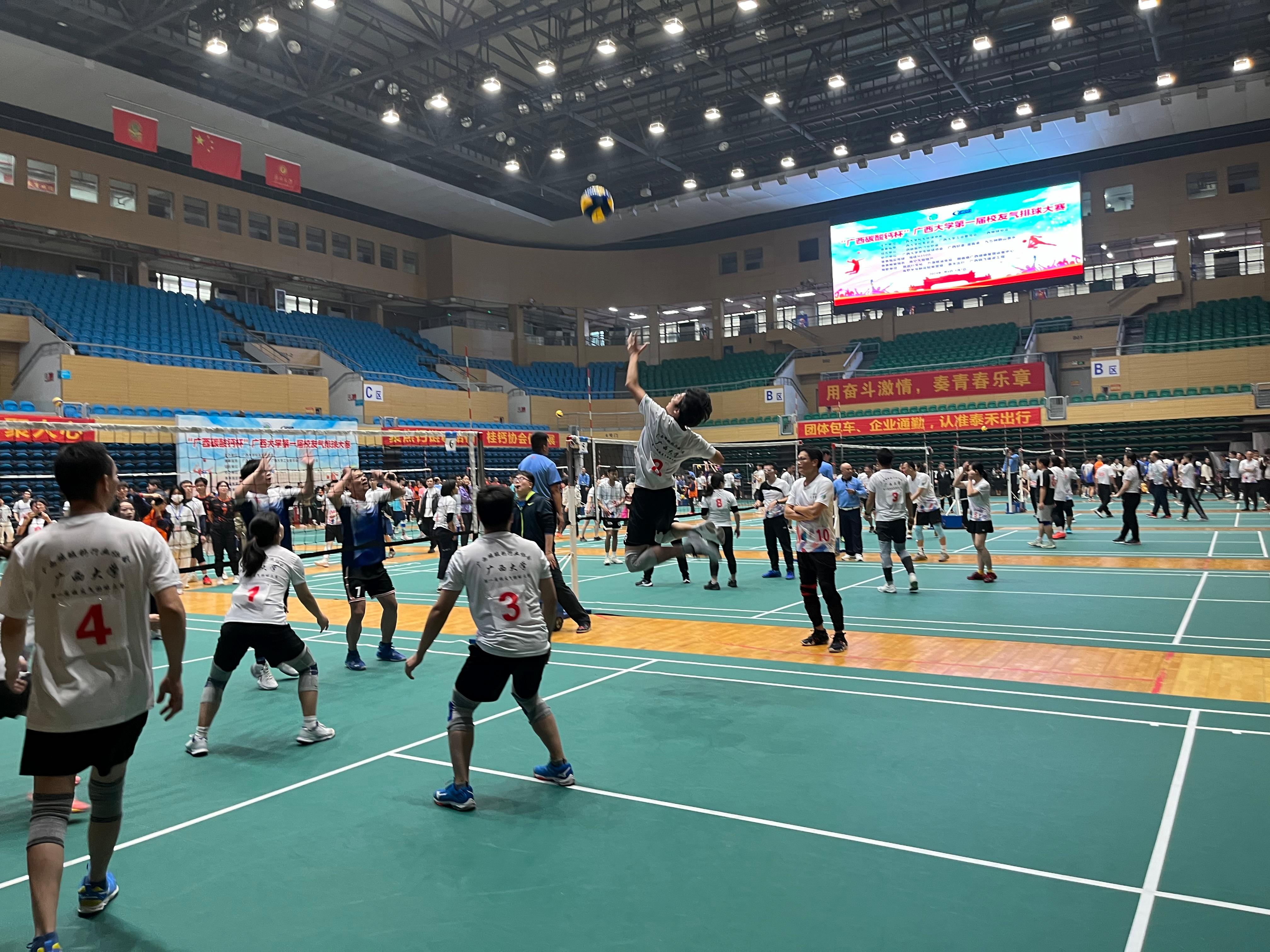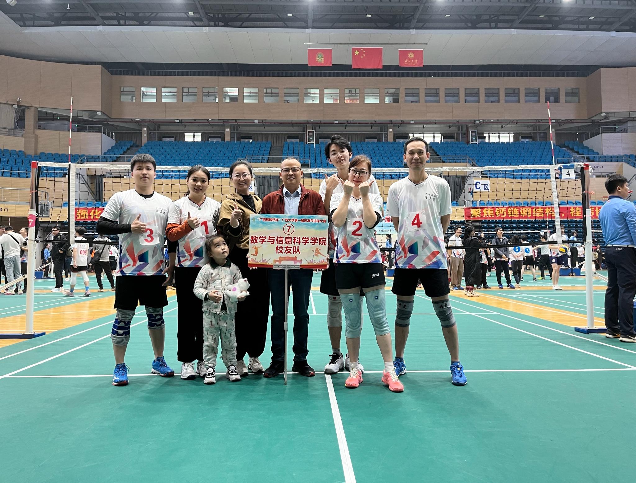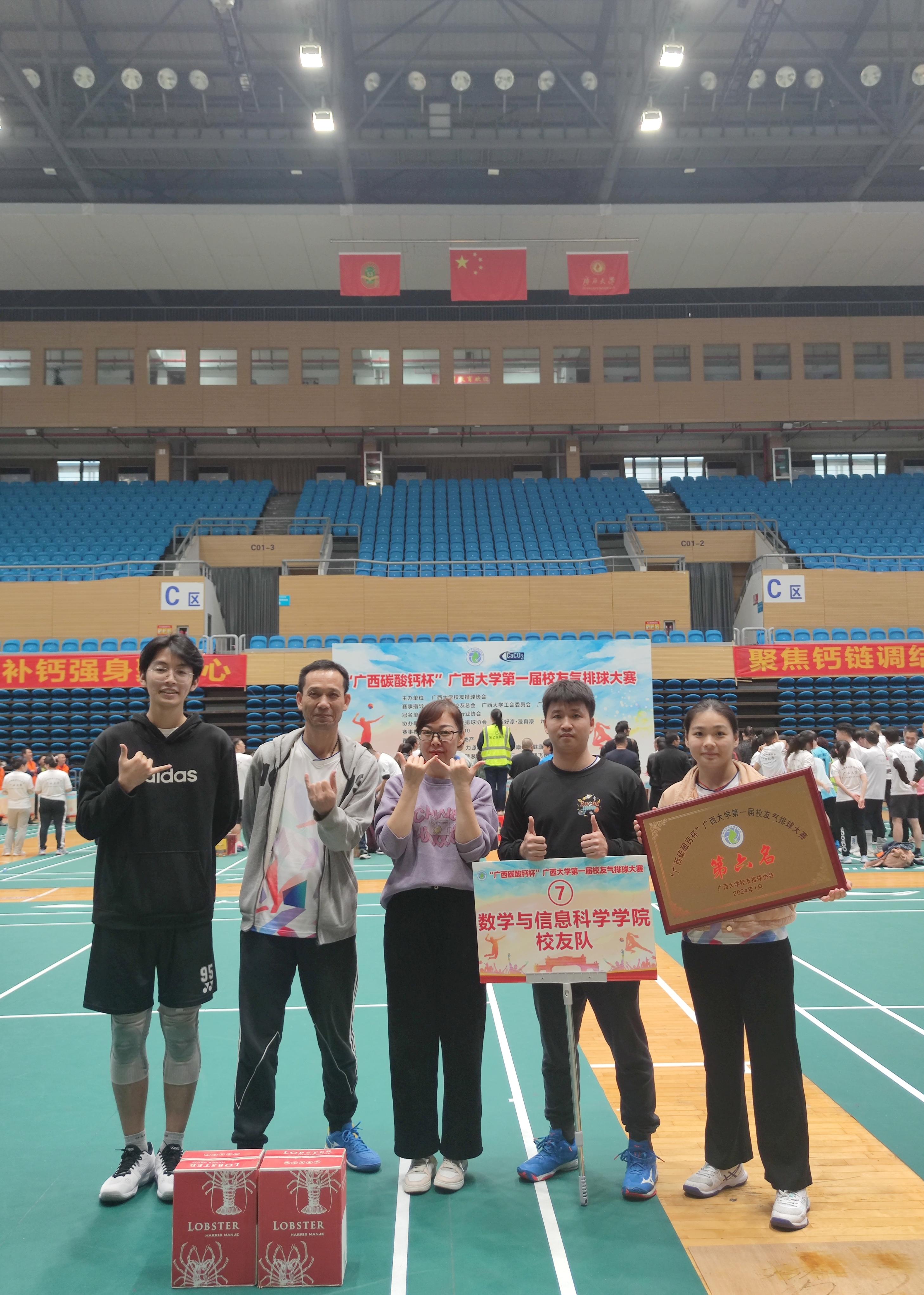 1月6、7日,“广西碳酸钙杯”beat365英国官网第一届校友气排球大赛在beat365英国官网西校园体育馆举行。数学与信息科学学院校友气排球队一路斗志昂扬、奋勇拼搏、团结协作,最终取得了第六名的好成绩。数信学院副院长石志刚、团委书记孙晓黎等老师到场指导并观看比赛。