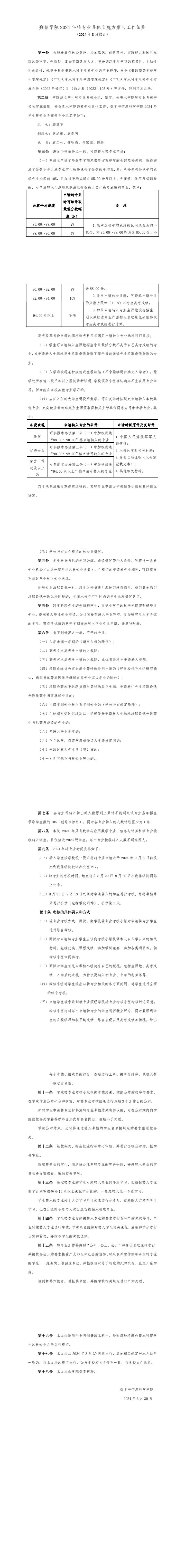 数学与信息科学学院2024年转专业具体实施方案与工作细则 (2024年3月修订)