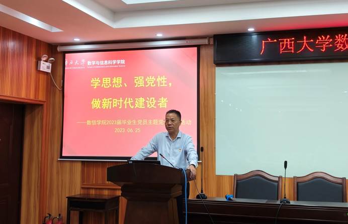 为深入开展学习贯彻习近平新时代中国特色社会主义思想主题教育,教育引导毕业生党员增强组织观念,以健康文明方式告别母校,激励毕业生党员走上新的岗位后继续发挥党员先锋模范作用,在“七一”建党节即将来临之际,6月25日上午,学院党委面向2023届毕业生党员开展了以“学思想、强党性,做新时代建设者”为主题的党性教育活动。数信学院党委书记黄建荣,党委副书记郭海燕出席了活动,学院有毕业生党员的支部书记、全体毕业生党员参加了活动。